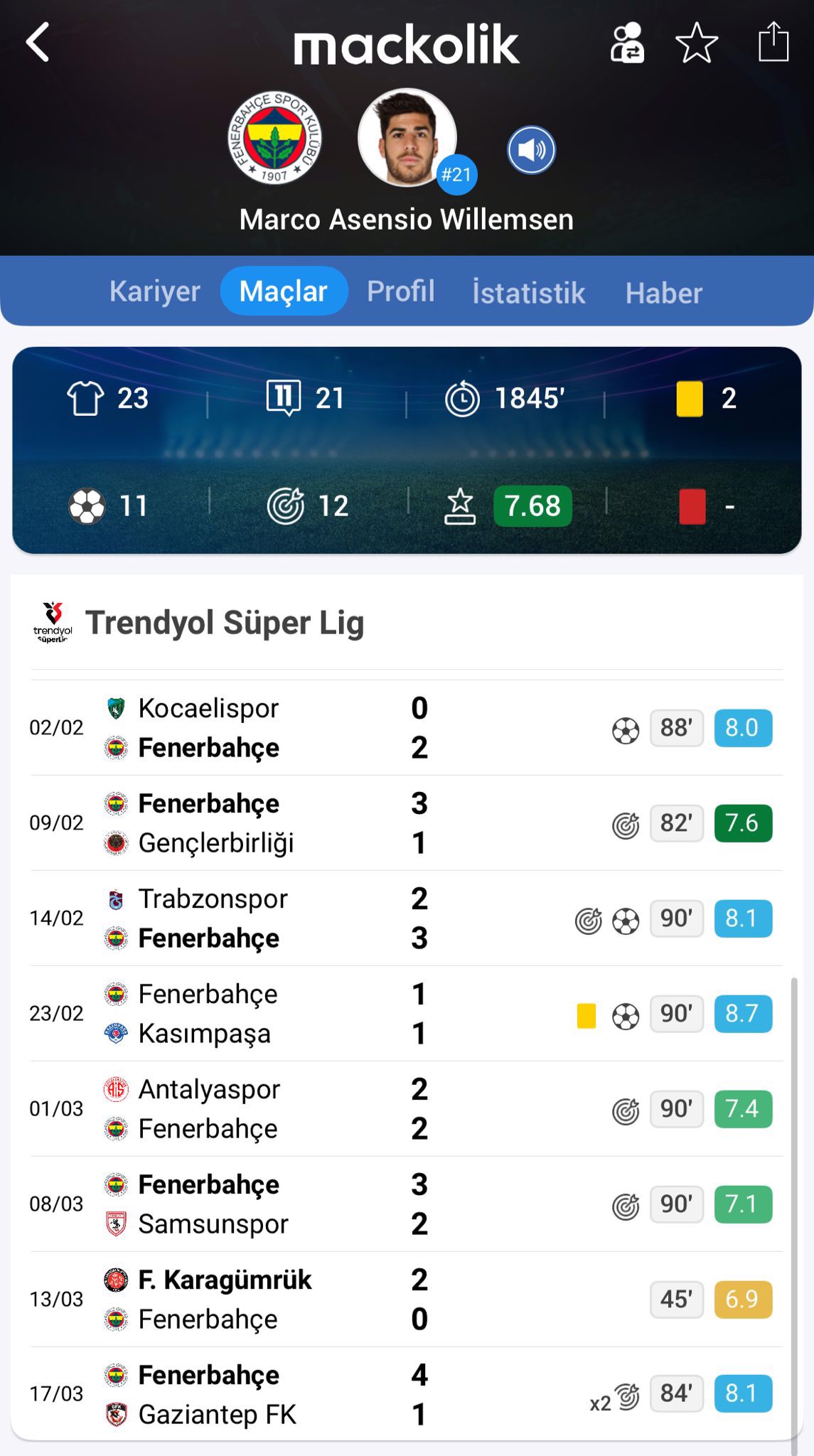 Süper Lig'in 28. haftasındaki dev derbide Fenerbahçe'de Marco Asensio sakatlanarak oyuna devam edemedi. Asensio'nun yerine oyuna Fred dahil oldu.